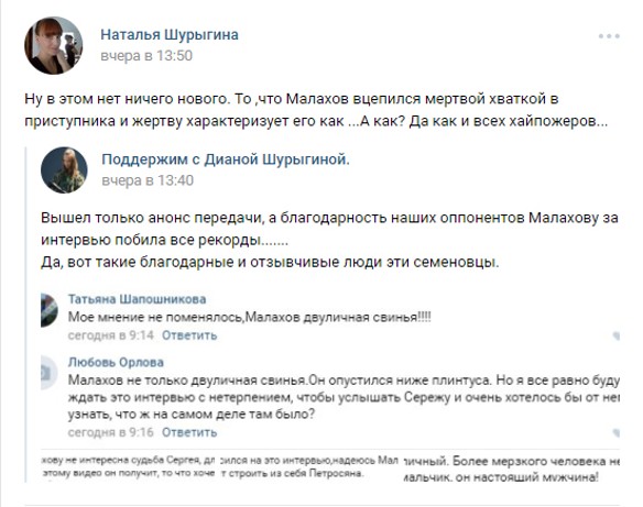 Между тем, поездка Малахова в колонию к насильнику вызвала негодование у мамы Шурыгиной. Она разместила гневный пост на своей странице в соцсети, где обвинила ведущего в двуличности и "хайпожерстве" и назвала его "двуличной свиньей".
