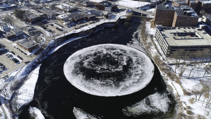 Жители американского городка Уэстбрук в штате Мэн стали свидетелями редкого природного явления - на реке, протекающей через населенный пункт, образовался гигантский диск, который к тому же еще и вращается, сообщает Medialeaks.