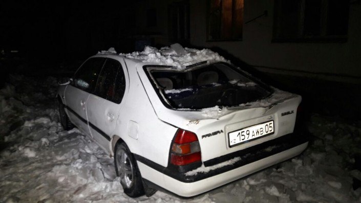 В Ауэзовском районе Алматы по улице Саина сосульки и снег упали на крыши сразу двух автомобилей - Nissan Primera и Toyota Camry.