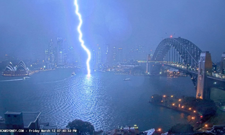 На кадрах, снятых веб-камерой центрального делового района Сиднея, был запечатлен момент, когда огромная молния ударила в воду, едва не задев причал парома у Круговой набережной (Circular Quay).