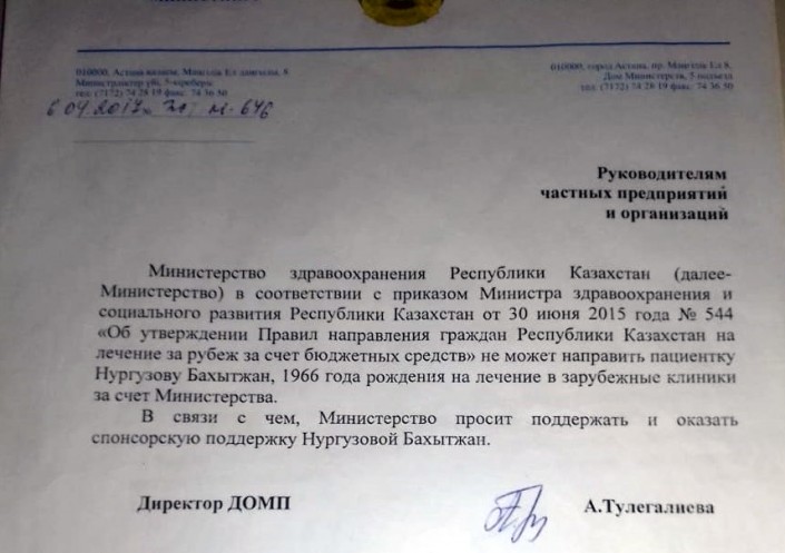 "В связи с этим министерство обратилось к руководителям частных предприятий и организаций с просьбой поддержать и оказать спонсорскую помощь в лечении пациентки Нургузовой", - говорится в документе.