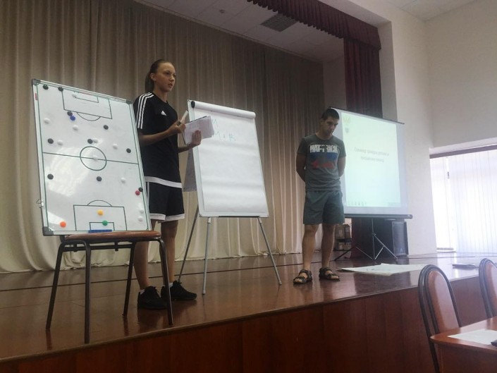 Иногда девушка выходит на поле в качестве футболистки. Она выступает за свой институт или играет за мини-футбольную женскую команду "КГПУ - Сибирячка". Но все же большую часть времени уделяет именно судейству.
