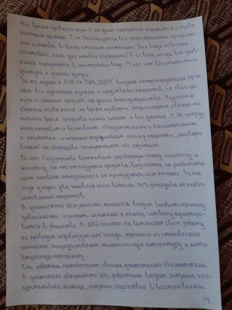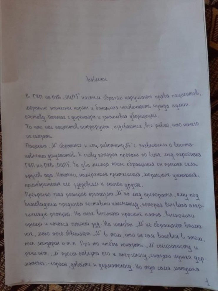 Пациент М. обратился к социальному работнику Б. с заявлением о восстановлении документов, которые, к слову, пропали по вине медперсонала центра здоровья. За два месяца после обращения он прошел семь кругов ада. Начались намеренные притеснения, моральные унижения, пренебрежение его здоровьем и многое другое. Прекрасно зная реакцию организма М. на медпрепарат, ему под благовидным предлогом поставили капельницу, которая вызвала аллергическую реакцию. На теле высыпали красные пятна", – говорится в заявлении пациентов.