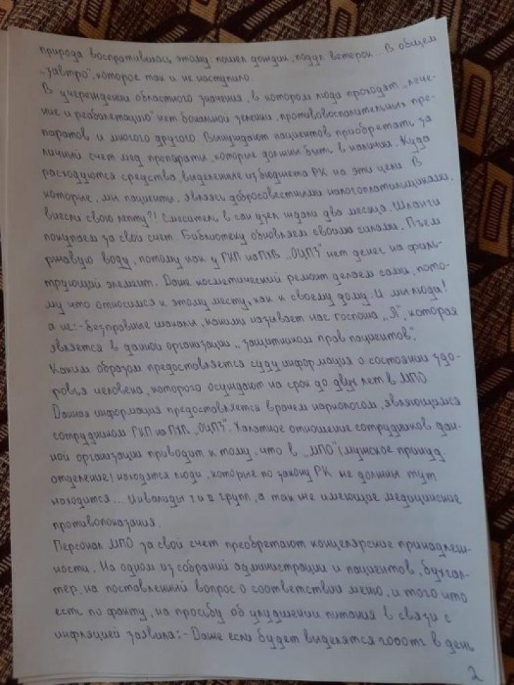 "К примеру, по питанию: я сам убедился, что порции недостаточные, и поручил поставщику питания этот вопрос решить. Все пункты будут рассмотрены на комиссии. Сегодня с ними встречался сотрудник прокуратуры. Кроме того, они не всегда сами готовы принимать препараты, назначенные им врачом, нарушают порядок. Вчера я разговаривал с ними, никаких прецедентов не было. Они говорили насчет голодовки. Я сказал: дайте время, неделю, мы будем комиссионно решать вопросы. Работника, про которого они написали в заявлении, мы временно отстранили", – пояснили в Центре психического здоровья.