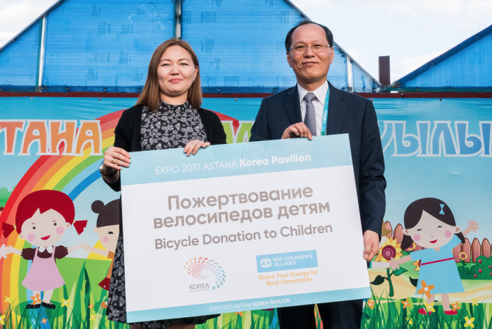 18 августа павильон Кореи, участник международной выставки Астана EXPO-2017, посетил международную благотворительную организацию по поддержке детей-сирот "SOS Детские Деревни" и провел благотворительное мероприятие по передаче велосипедов, собранных с помощью участия посетителей.