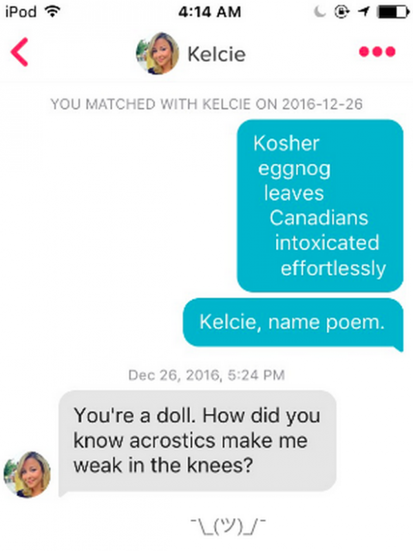 25-летний пользователь Tinder из Канады Джо Бэйгл (Joe Bagel) заявил, что изобрел способ добиться стопроцентного ответа от женщин при онлайн-знакомствах, сообщает The Daily Mirror. По его словам, "ключом" к женским сердцам стали акростихи, составленные из первых букв их имен.