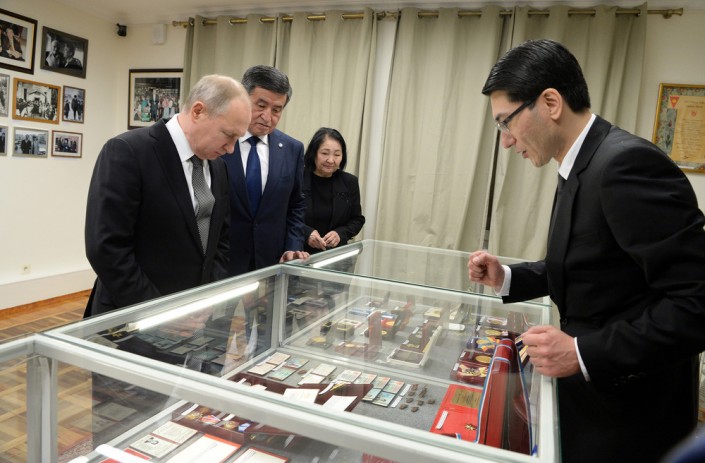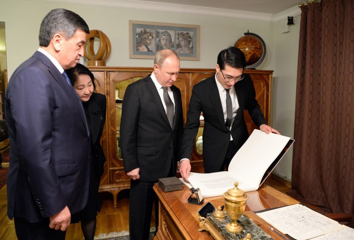 Президенты побеседовали с семьей писателя, сын Чингиза Айтматова Эльдар Айтматов рассказал о музее, жизненном пути и творчестве отца. Жээнбеков и Путин осмотрели экспозиции музея, а также оставили свои пожелания в книге почетных гостей.
