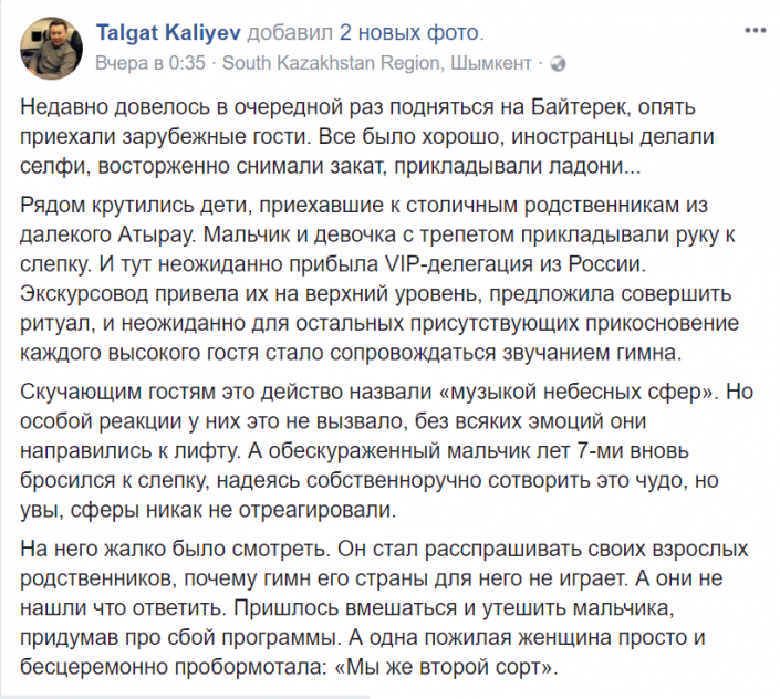 Политолог Талгат Калиев в Facebook поделился впечатлением от посещения монумента "Байтерек". Он рассказал о мальчике и девочке, которые с трепетом прикладывали руки к слепку. В это время в главный зал вошли представители "VIP-делегации" из России. Экскурсовод привела их на верхний уровень, предложила совершить ритуал, и неожиданно для остальных присутствующих прикосновение каждого высокого гостя стало сопровождаться музыкальной композицией.