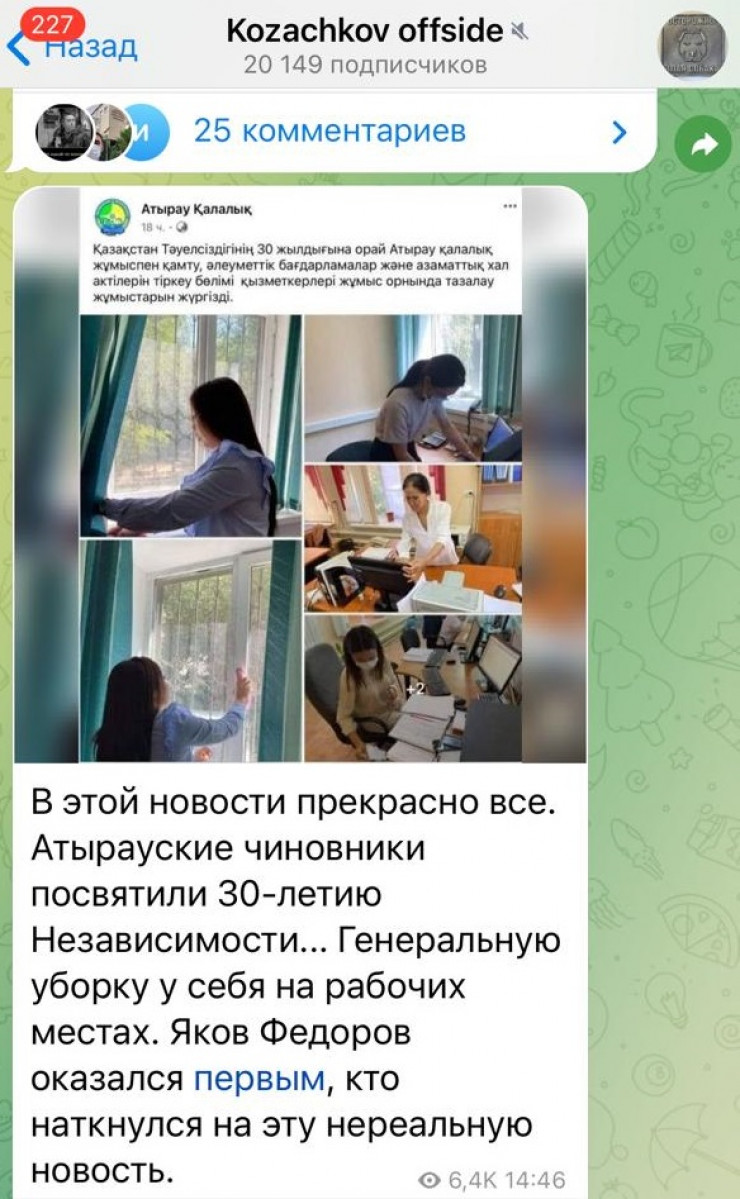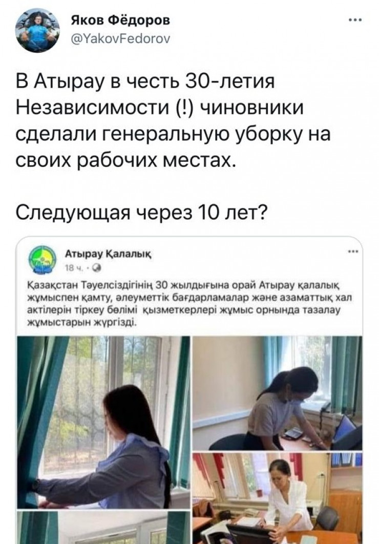 В социальных сетях бурно обсуждается мероприятие, проведенное атыраускими госслужащими. На официальной странице городского отдела занятости, социальных программ и РАГС опубликован пост об уборке сотрудников на рабочем месте в честь 30-летия независимости Казахстана. Скрины публикации быстро разошлись по пабликам в соцсетях, передает корреспондент Tengrinews.kz.