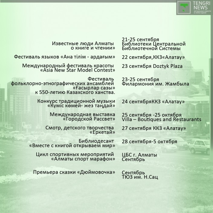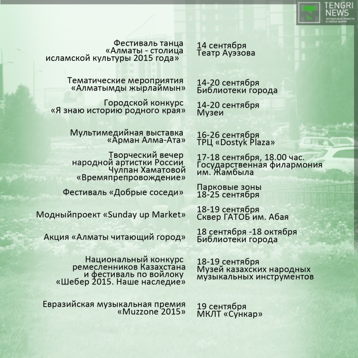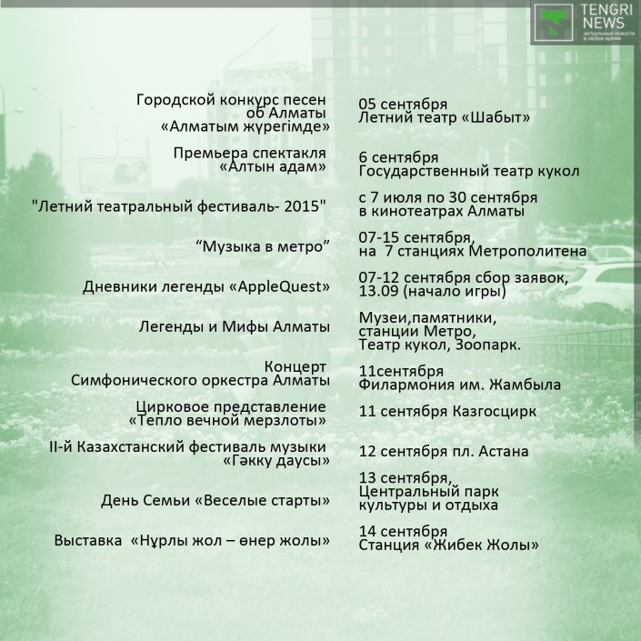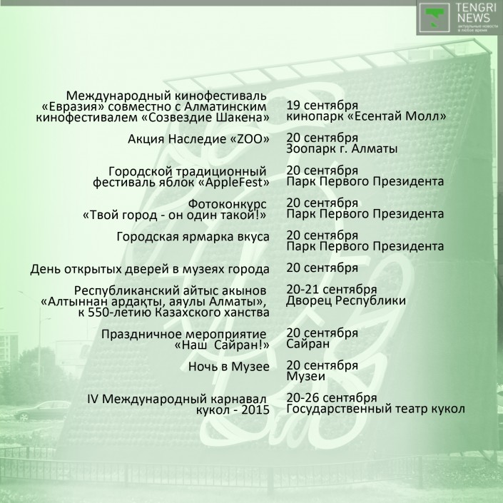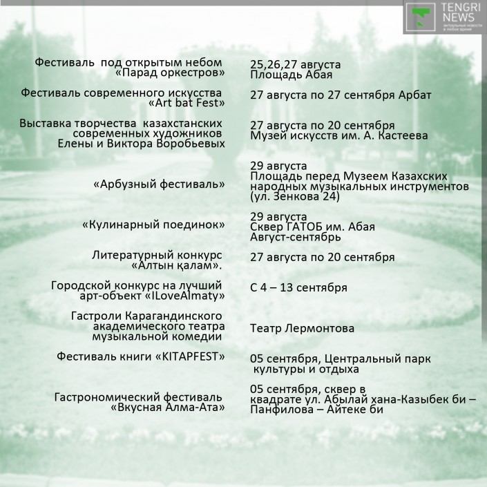 Праздник традиционно откроет "Парад оркестров", который пройдет с 25 по 27 августа на площади Абая перед Дворцом Республики. Следом стартует фестиваль современного искусства Artbat Fest. Среди новых событий - "Арбузный фестиваль", который состоится 29 августа на площади перед Музеем казахских народных музыкальных инструментов, концерты в алматинском метро, Apple Quest, в котором участники игры будут выполнять ряд заданий, находя ключи, подсказки и ответы в музеях Алматы, на станциях метро, в театрах и парках.