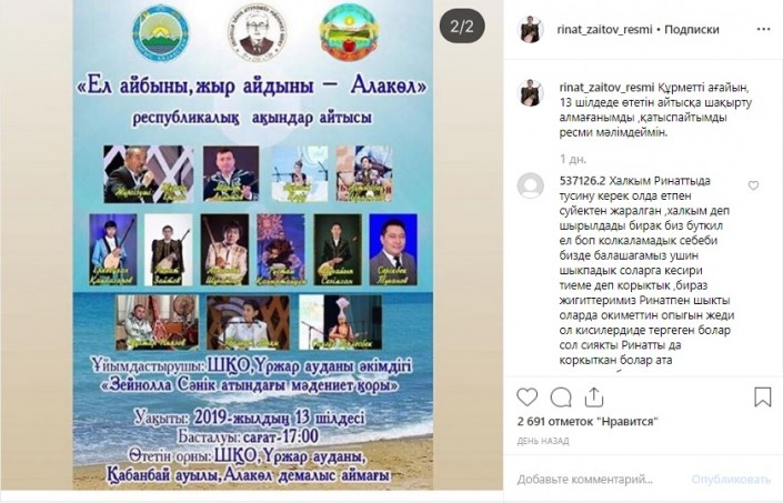 Айта кетейік, мұның алдында айтыскер ақын Ринат Зайытов Instagram желісінде ШҚО-да өтетін айтысқа шақырту алмағанын және қатыспайтынын, алайда постерінде суреті тұрғанын мәлімдеген.