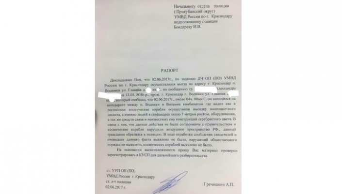 Как пишет местный сайт "Кубанские новости", мужчина утверждал, что видел семерых инопланетян ростом около семи метров в серебристых скафандрах, они "высадились" из НЛО. Отмечается, что на место выезжал старший участковый уполномоченный отдела полиции Прикубанского округа Алексей Гречишкин. Он пояснил, что полиция обязана реагировать на все звонки, поступающие от жителей Краснодара, но сказал, что подробности не может разглашать до окончания проверки.