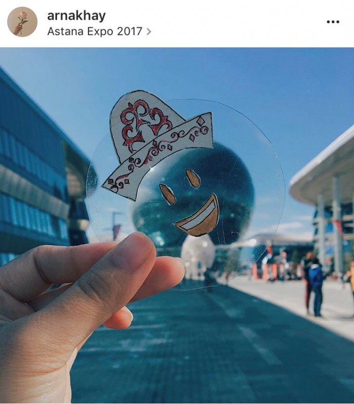 "Я решила сделать такие рисунки, чтобы все люди представляли сферу в виде смайлика. Я добавила туда национальную шапочку, потому что сфера - это наш, казахстанский павильон", - рассказала Арна Нахай.