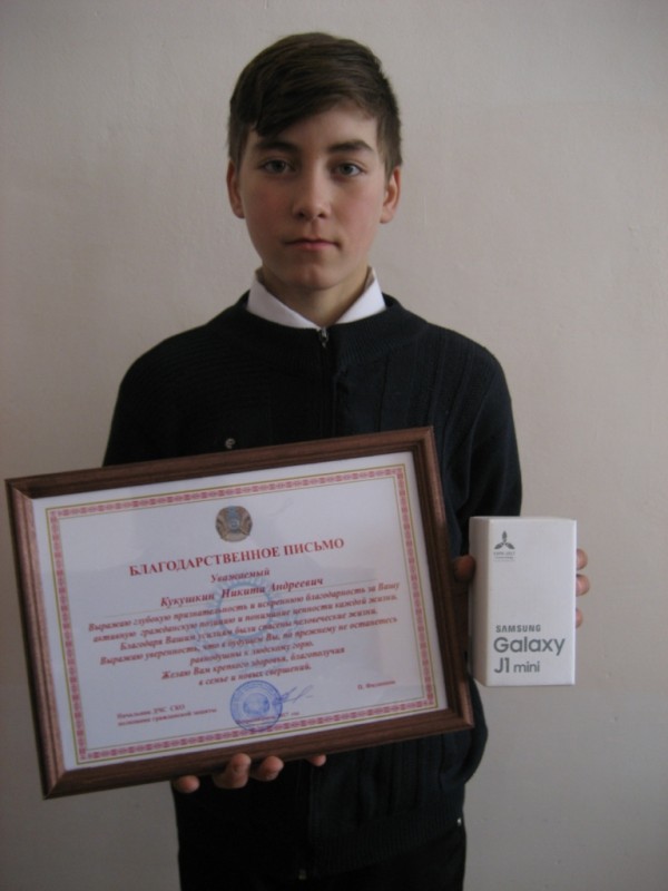 За неравнодушие и инициативу Никиту Кукушкина наградили спасатели. Вручили благодарственное письмо от начальника ДЧС СКО, а также сотовый телефон. Теперь, в случае опасности, школьник сможет не терять время и сразу вызвать службы экстренного реагирования.