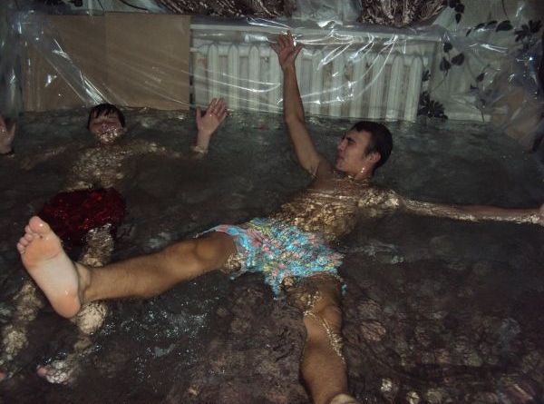 На фотографиях, которые молодые люди выложили в социальные сети, видно, что импровизированный водоем сделан с помощью нехитрых материалов - полиэтиленовой пленки, картона, скотча, брезента. Остается неясным, как и куда ребята собираются сливать воду и в курсе ли их "забав" собственник жилья.