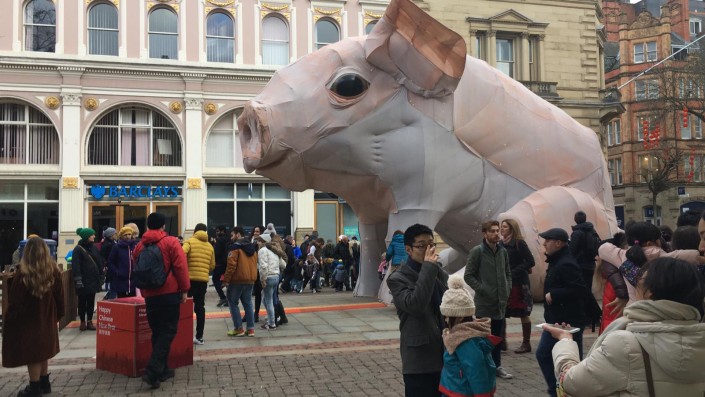 Сейчас британский художник работает над созданием огромной инсталляции в виде свиньи в Манчестере. Арт-объект устанавливают в честь китайского Нового года.