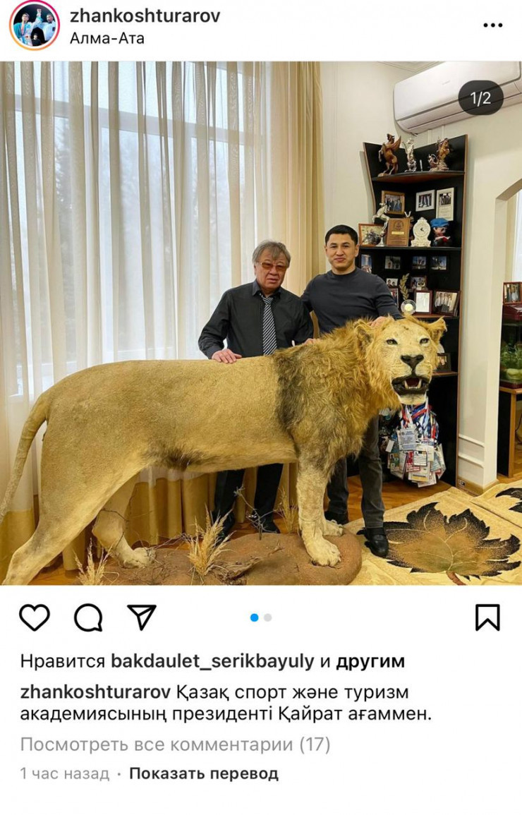Биыл 20 қаңтарда кабинетіндегі қар барыстарының терілерімен суретке түскен спорт және туризм академиясының президенті Қайрат Закирьяновтың басы дауға қалған болатын. Закирьяновпен бірге түсірілген суретті спортшы Жанкош Тұраров Instagram желісінде жариялады. Суреттерде арыстанның, сілеусіннің, барыстың және құстардың терілерімен толтырылған жануарлар көрсетілген.