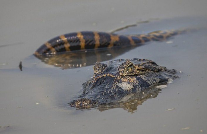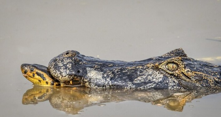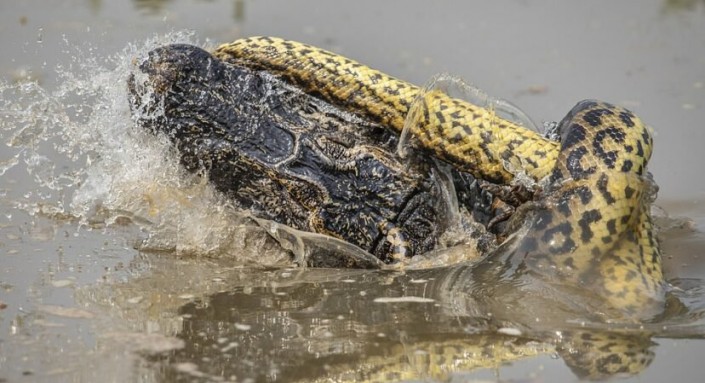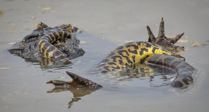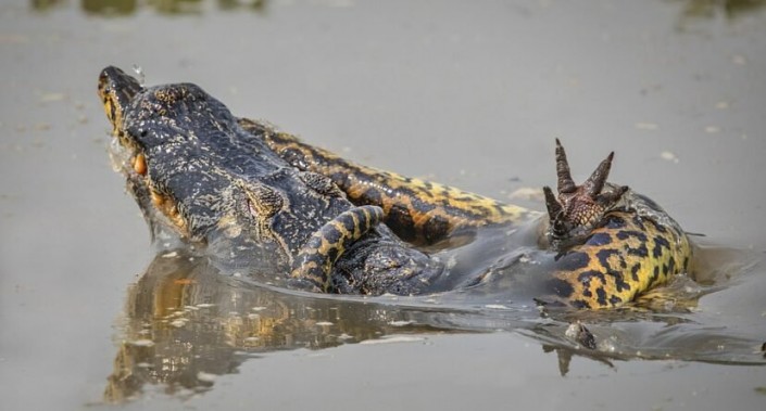 Схватку гигантской анаконды и каймана засняли в болотах Амазонки