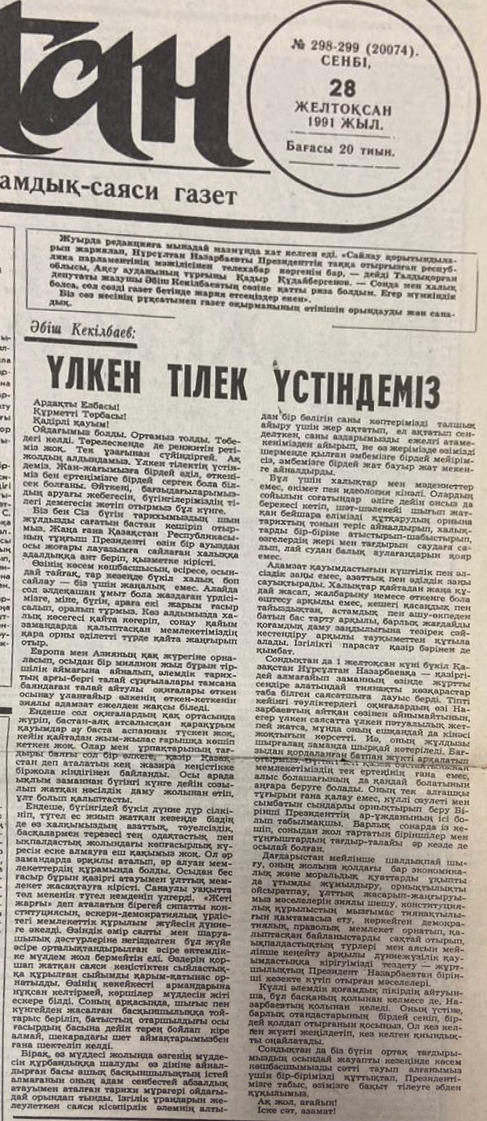 Көрнекті қаламгер Әбіш Кекілбаев "Егеменді Қазақстан" газетінде "Үлкен тілек үстіндеміз" атты мақаласында тарихқа терең үңіліп, қазақ елінің өзге елдермен терезесі теңесіп жатқанын мақтап, мадақтап, Елбасына табыс тілеген екен.