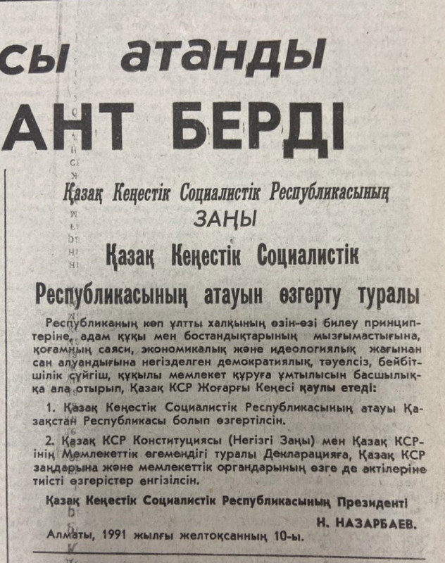 Ал бұл Қазақ Кеңестік Социалистік Республикасының атауын Қазақстан Республикасы деп өзгерту туралы заң, 1991 жыл, 10 желтоқсан.