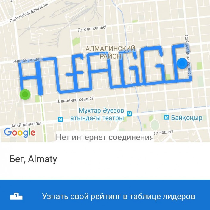 Трое алматинцев пробежали полумарафон, чтобы написать на карте "Алга GGG" Скриншот с Google.maps