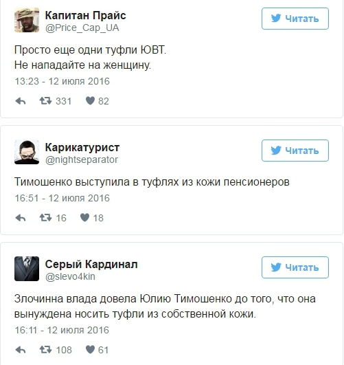 Выбор обуви Тимошенко вызвал массу возмущений и издевок среди пользователей социальных сетей. В частности, некоторые из них начали шутить, что туфли сделаны из кожи самой Тимошенко либо из кожи пенсионеров.