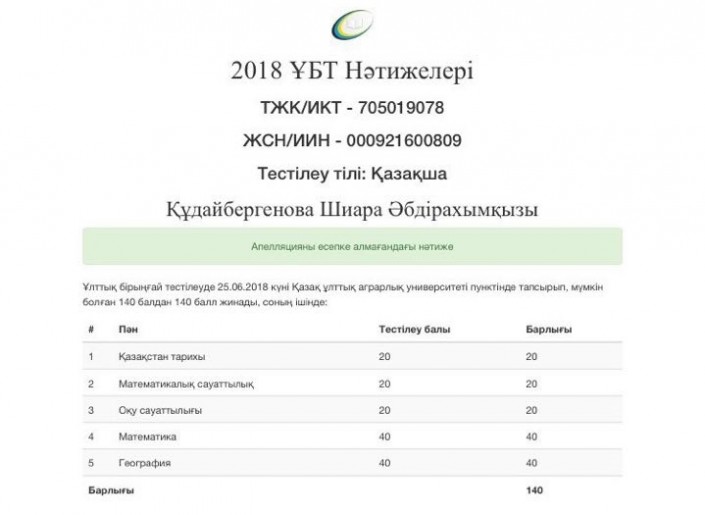 "Екі сұрақтың ішіндегі бірі - "1845 жылы болған оқиға" деді. Оның жауабы Бөкей ордасында хандық биліктің жойылуы болды. Екінші сұрақ - "Хандарды ретімен сәйкестендіріңіз". Сенімді болмасам да, дұрыс толтырыппын. 140 балл алғаныма өте қатты қуандым", - деген Шиара ҰБТ-ға дайындалуға көмектескен ұстазына тікелей эфирде алғыс айтты.