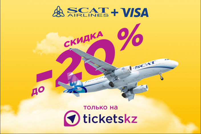Авиакомпания SCAT и онлайн-трэвел-агентство Tickets.kz при поддержке платежной системы VISA предлагают уникальные скидки до 20 процентов по всем направлениям. Маршруты авиакомпании SCAT связывают как крупнейшие города Казахстана, так и страны ближнего зарубежья. Перевозчик ежегодно входит в список ведущих авиакомпаний республики.