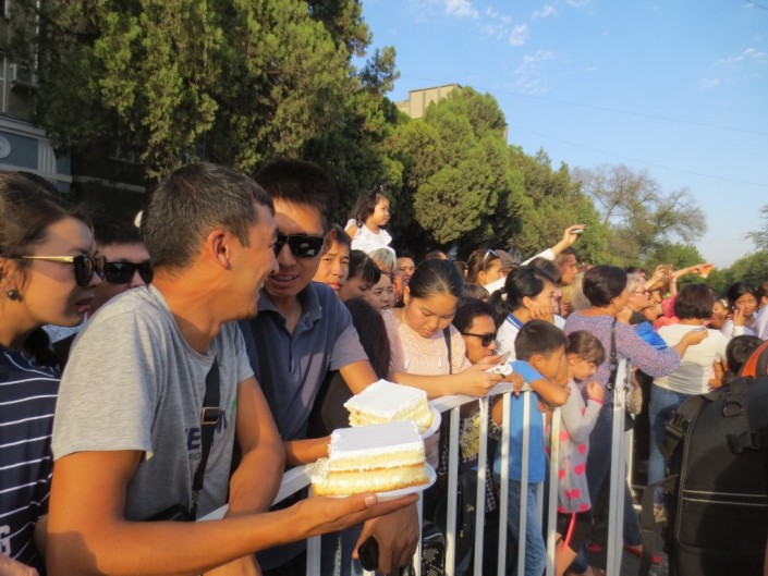 Кусочки праздничного торта продавались всем желающим за символическую сумму – 25 сомов (125 тенге). Все собранные от продажи средства пошли на благотворительность. Деньги направили на закупку оборудования для детского центра онкологии Кыргызстана.