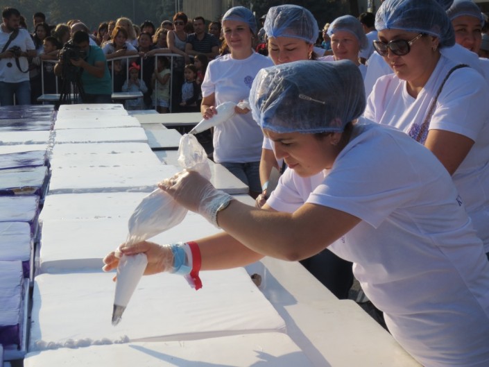 Кондитерское изделие собирали прямо на центральной площади столицы республики из множества отдельно испеченных частей. Размер торта – 100 квадратных метров, вес - около 2 тонн, торт рассчитан примерно на 20 тысяч человек. По признанию кондитеров, приготовленный торт является самым большим не только в Кыргызстане, но и во всей Центральной Азии.
