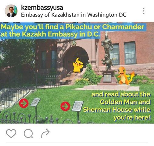 Об оригинальной акции рассказал у себя на странице в Facebook директор Евразийского совета по международным отношениям Жанболат Усенов. Речь идет об онлайновой игре Pokemon Go с геолокацией и дополненной реальностью. "Сила пикачу в дипломатии! Посол Казахстана приглашает вашингтонцев половить покемонов и заодно побольше узнать об одном из символов РК - "золотом человеке", - написал на своей странице в социальной сети Усенов.