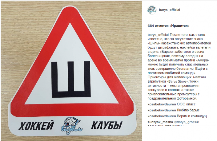 "После того как стало известно, что за отсутствие знака "Шипы" казахстанских автолюбителей будут штрафовать, наклейки взлетели в цене. "Барыс" заботится о своих болельщиках, поэтому сегодня на арене во время матча против "Амура" можно будет получить спасительный знак совершенно бесплатно. Еще и с логотипом любимой команды", - говорится на официальной странице клуба в Instagram.