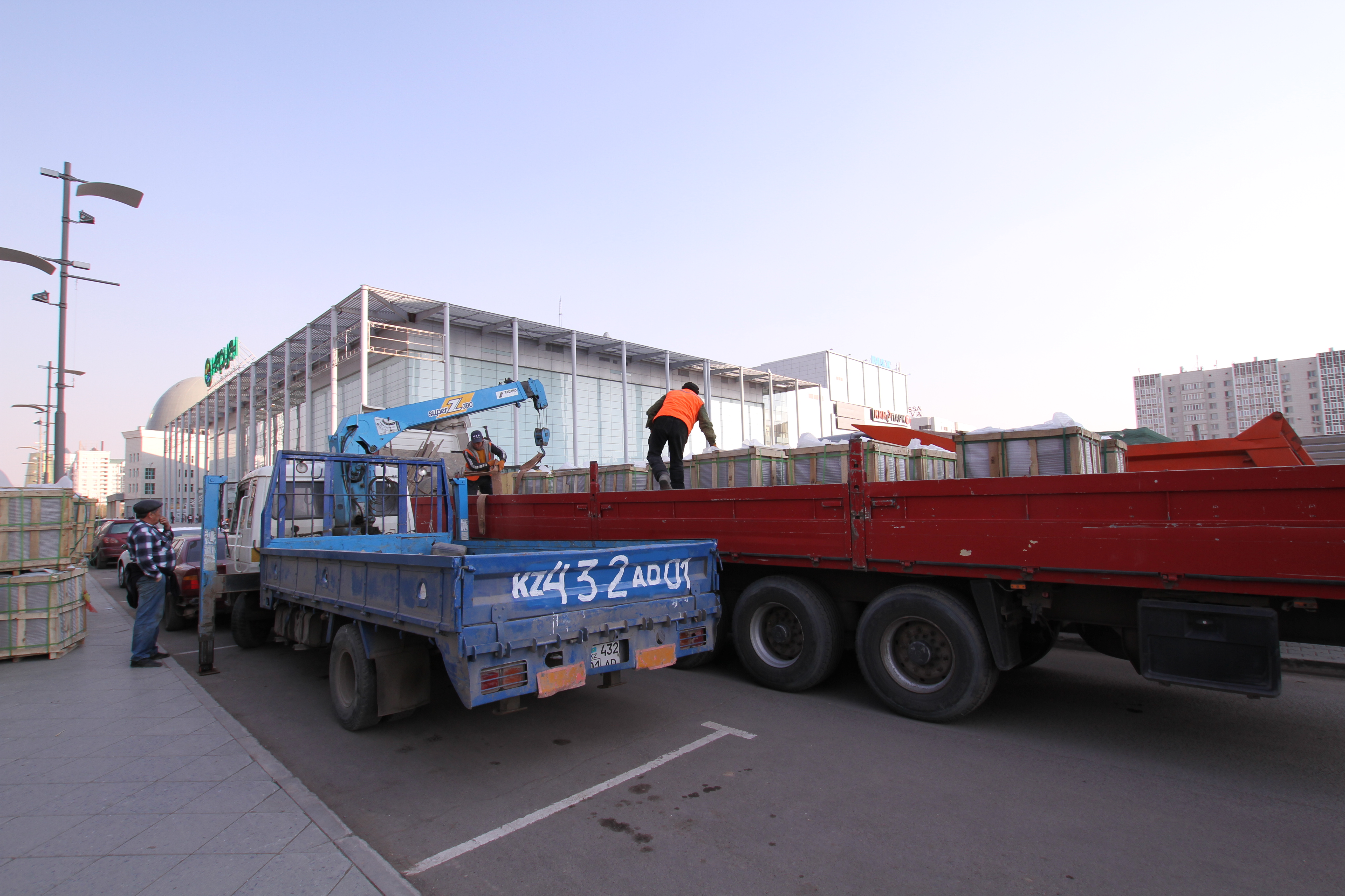 Рабочие разгружают грузовики со стройматериалами.
