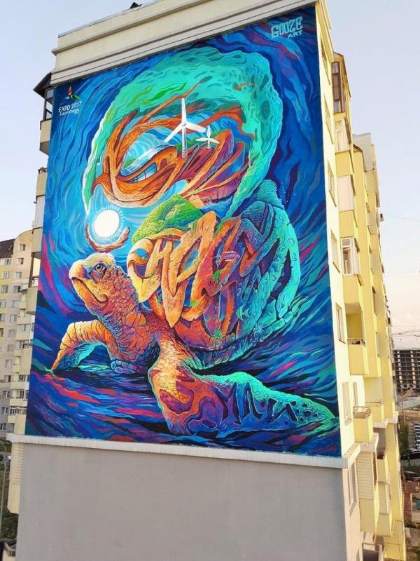 Георгий Куринов, более известный как GOOZE из России разрисовал здание в Алатауском районе. Художнику нравится, когда его рисунок можно долго и тщательно рассматривать, выдвигать какие-то идеи, размышлять и находить в нем свое видение. Он изобразил черепаху, которая по его словам, имеет древний символ мироздания. На панцире и плавнике животного зашифрована фраза "Энергия земли", на дереве - эко-дом будущего с солнечными батареями и ветряными генераторами. Посередине находится небольшая ГЭС. Таким образом, художник решил встать на защиту природы и животного мира.