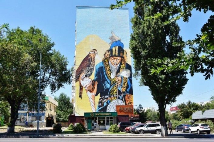 Другой фасад в Бостандыкском районе расписал художник из Украины Андрей Пальваль. Свою работу он решил посвятить теме беркутчи. И это неспроста. Андрей предпочитает рисовать портреты людей, а также птиц. В своей работе ему удалось совместить эти два образа, сохранив при этом азиатский колорит.