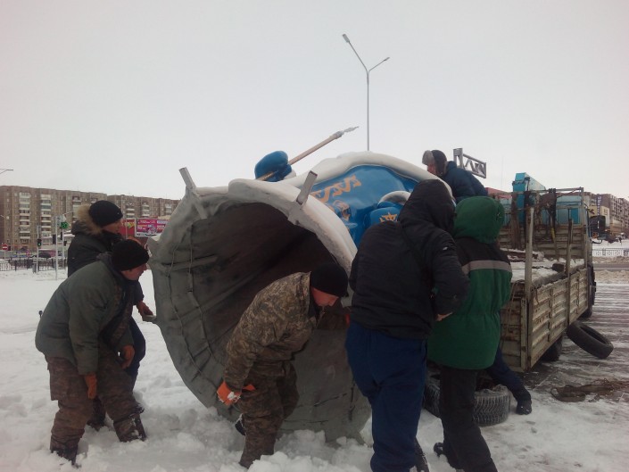Сегодня скульптуру установили перед недавно открывшимся Домом дружбы на Юго-Востоке Караганды. Дед Мороз со светящимся посохом поставили около елки. Авторы конструкции тщательно вытерли каждый сантиметр своего "детища" и даже поверили скульптуру на прочность, встав на руки сказочного персонажа.