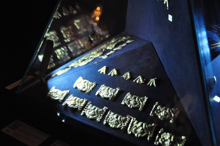 В кургане найдено свыше четырех тысяч золотых изделий: детали, декорировавшие одежду, а также украшения и бытовая утварь. Особое место в экспозиции занимает обнаруженная среди находок кургана Иссык серебряная чаша с надписью, выполненной руническим письмом, – один из древнейших памятников письменности, найденных на этой территории.