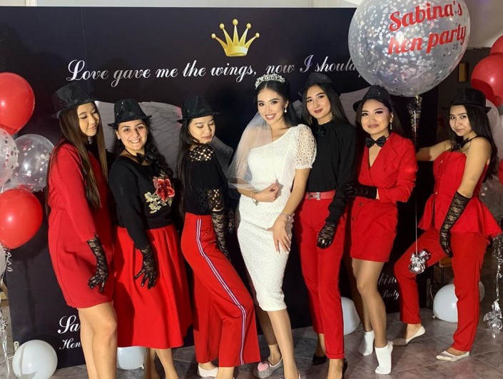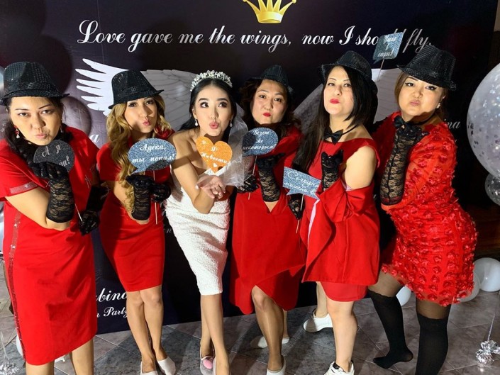 Hen Party алматылық сұлу ақ көйлек киіп, басына фата таққан. Ал жанындағы құрбылары қызыл-қара түсті үйлестіріп, джаз стиліндегі образды таңдаған.