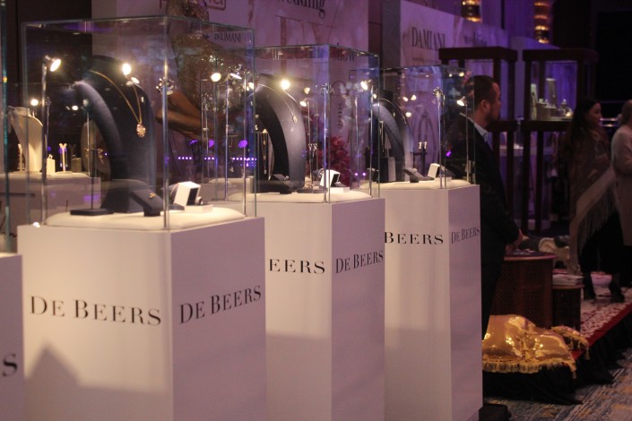 Средняя стоимость изделий De Beers, представленных на выставке: кулон около 15 тысяч долларов, кольца - 5 тысяч долларов, серьги - 9 тысяч долларов.
