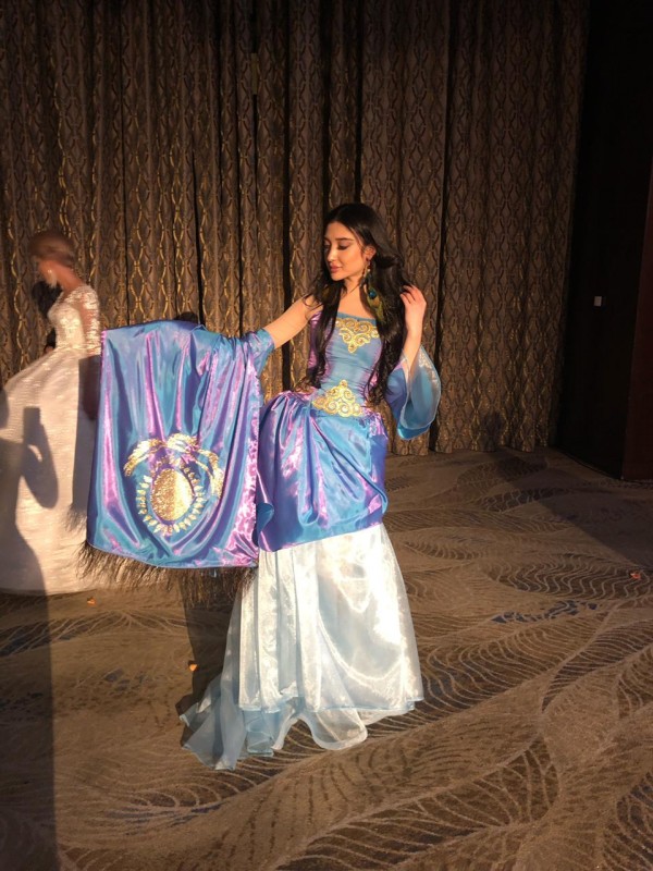 Платье Амины Кожановой называется "Поднебесье". Оно выполнено в голубом цвете с золотыми вставками в виде орнамента. У платья есть накидка, на спинке которой изображен флаг Казахстана.