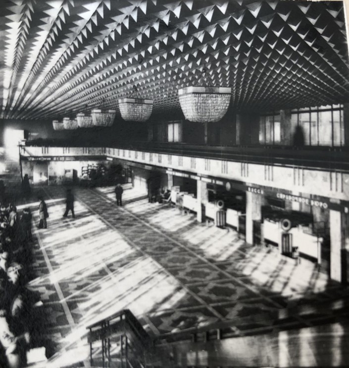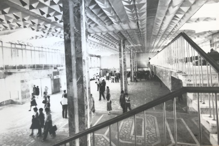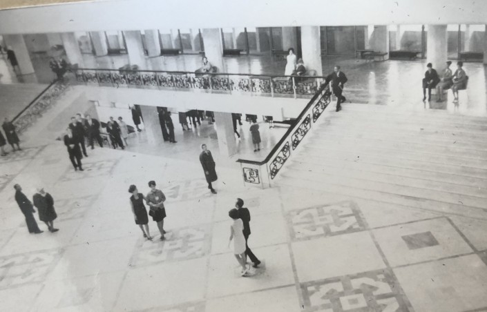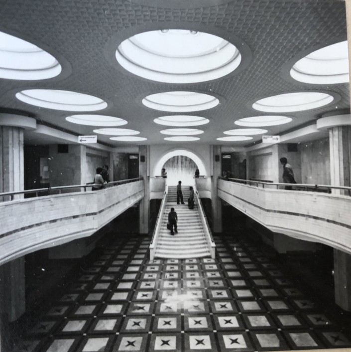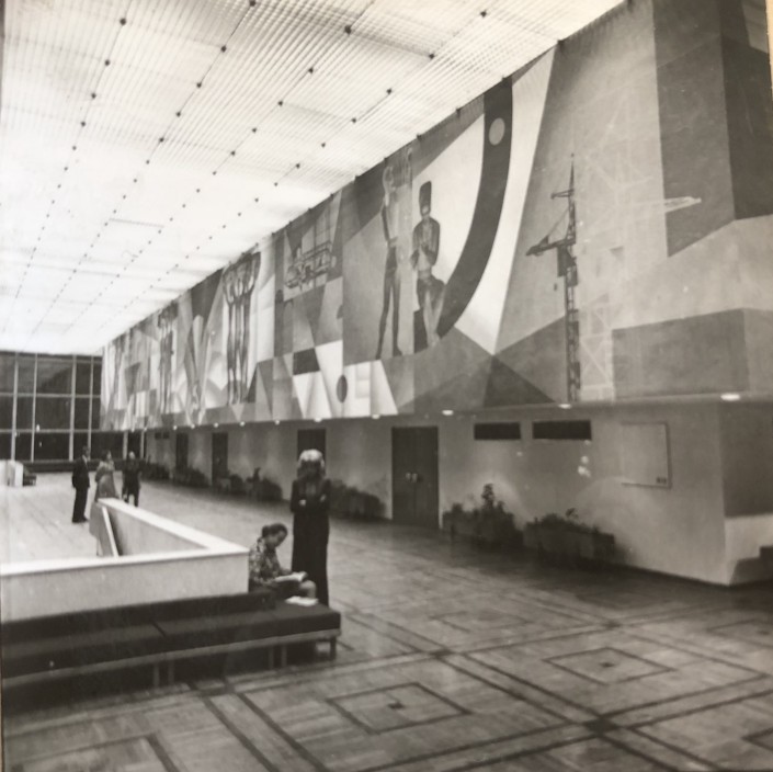 1970 год, фойе дворца молодежи, Целиноград. И снова характерные для периода СССР фрески на стенах и геометрические узоры.