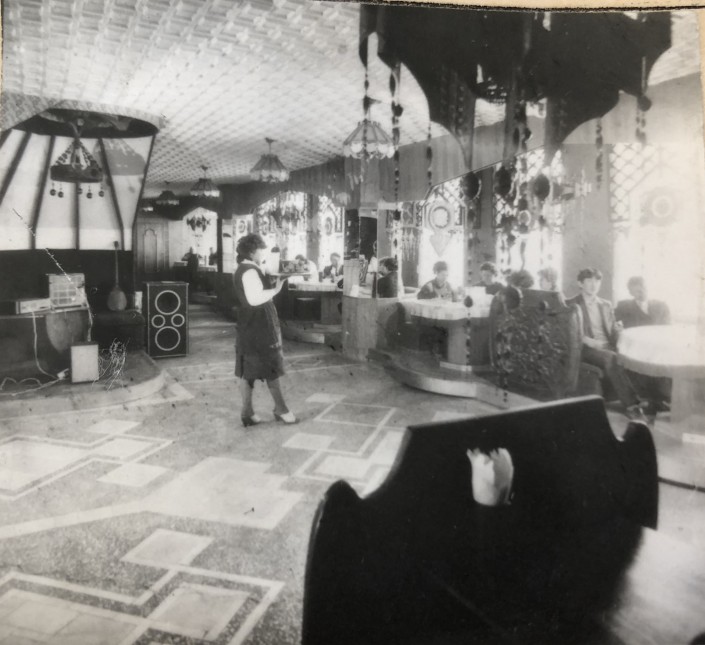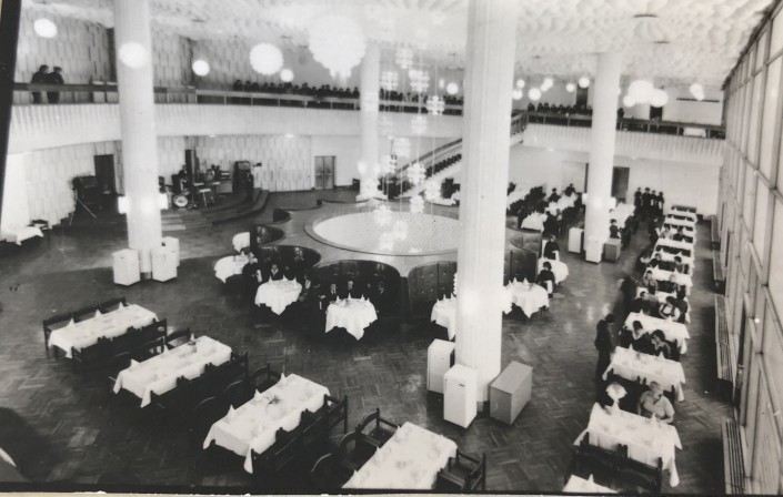 1979, Один из залов ресторана "Казахстан", Алма-Ата. Это помещение отличают высокие потолки, массивные колонны, множество люстр и наборный паркет.