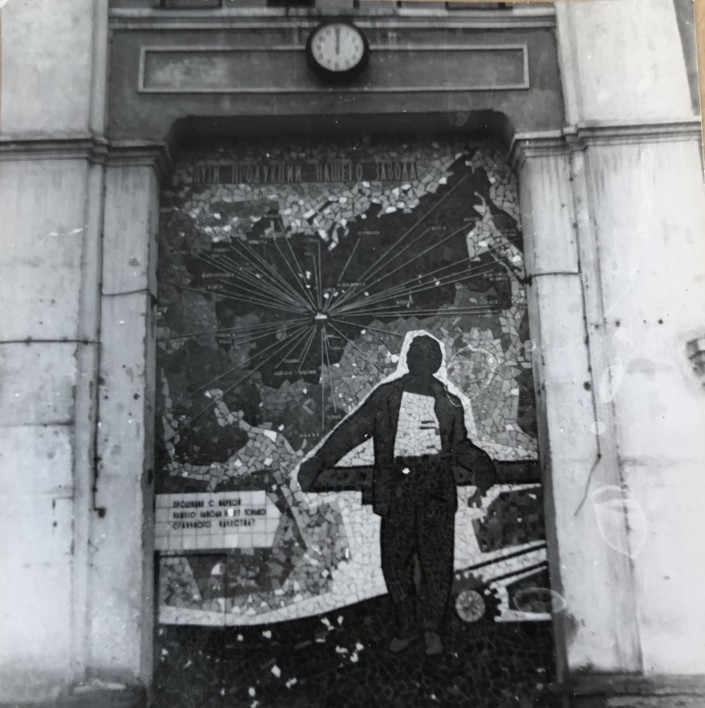 Мозаичное панно на Ново-Карагандинском заводе горного оборудования. "Пути продукции нашего завода" гласит надпись на мозаике. Саму мозаику собирали из цветных глянцевых кусочков из спецматериала. К слову, в советское время мозаичная техника была очень распространена. В 60-70 годах это искусство приобрело идеологическую направленность. Тематика работ чаще всего -  герои труда и покорение космоса.