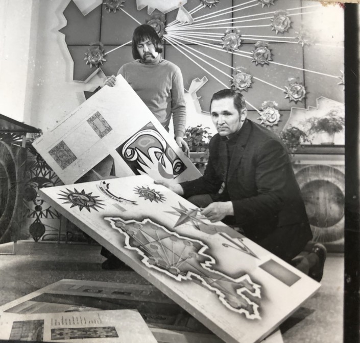 Художники за оформлением зала почтового отделения, Актюбинск, 1971. Основной мотив настенных барельефов - солнце, луна, звезды и геометрические узоры.