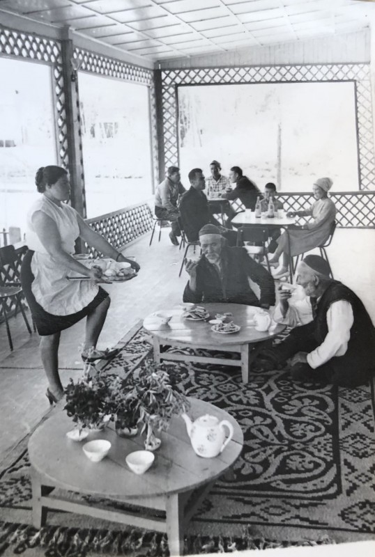 Чайная "Кара-Су" в селе Мерке Джамбульской области, июнь 1966 года. Внутренний вид. Чайные мало изменились с тех пор. И в наше время встречаются небольшие кафе, где на топчане за низким столиком можно выпить душистого чаю в жаркий полдень.