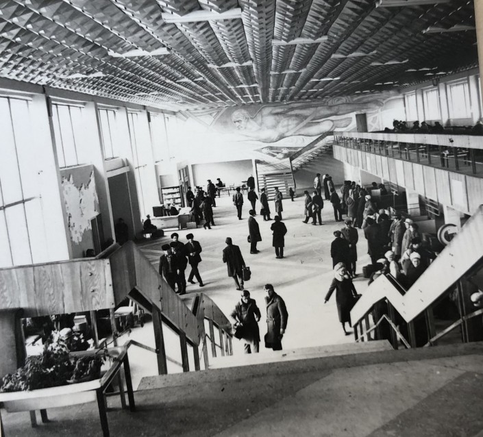 Караганда, новый аэровокзал, 1973 год. Здесь небольшое отличие - огромная фреска или мозаика на всю стену, изображающая летящего человека. Монументальное искусство во всей красе.