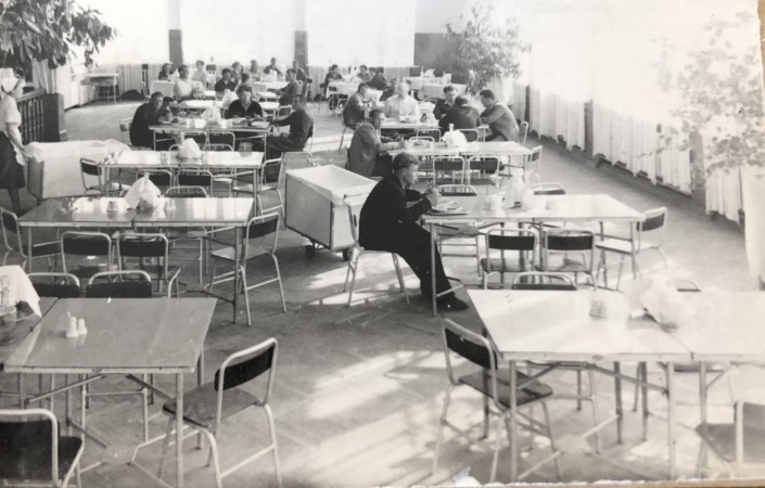Интерьер столовой Усть-Каменогорского свинцово-цинкового комбината, 1955 год. Типовой общепит.