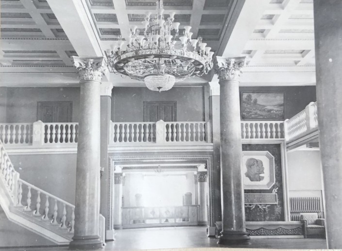 1952, Дворец культуры, интерьер фойе, Балхаш. Перила балкона и лестницы с балясинами, массивная люстра, высокие потолки, много света и "почитаемого" советскими дизайнерами мрамора. Так может выглядеть холл и в современном здании. Из общего вида "выбивается" барельеф с изображением Владимира Ленина и Иосифа Сталина.