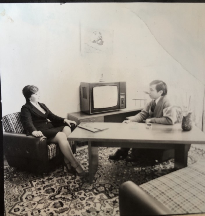1978, Алма-Ата, в номере высотной гостиницы "Казахстан". На полу модный в то время, мечта любой домохозяйки, "цветной" ковер. Журнальный столик отличается массивностью, он, скорее всего, тяжелый. Кресла и диван - из одного гарнитура. Подлокотники обиты, по всей видимости, кожзамом. Тренд 70-80 х годов - крупные пуговицы на мягкой мебели.