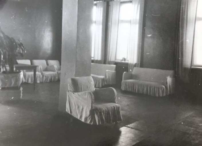 Алма-Ата, 1963, интерьер фойе центральной городской бани. Кресла и диваны под специальными накидками. Угадываются знакомые многим деревянные подлокотники и ровные твердые сиденья.
